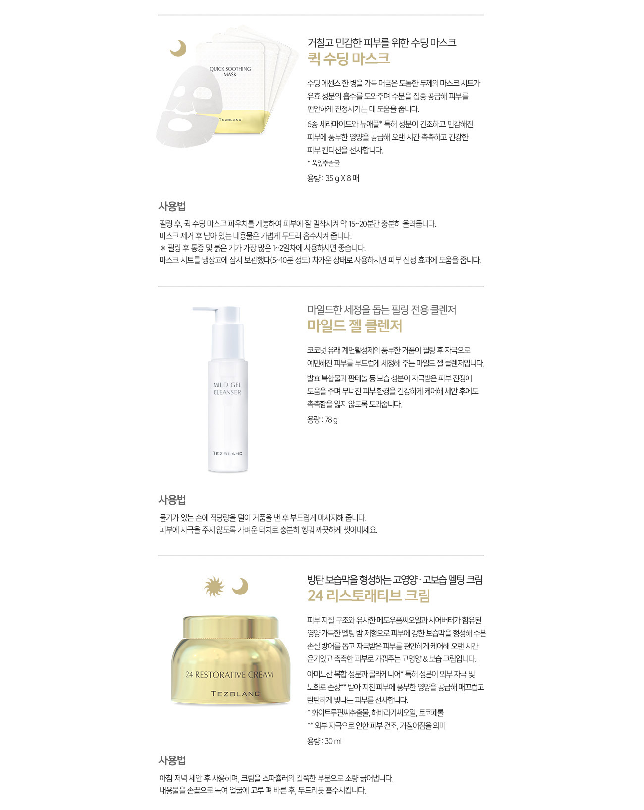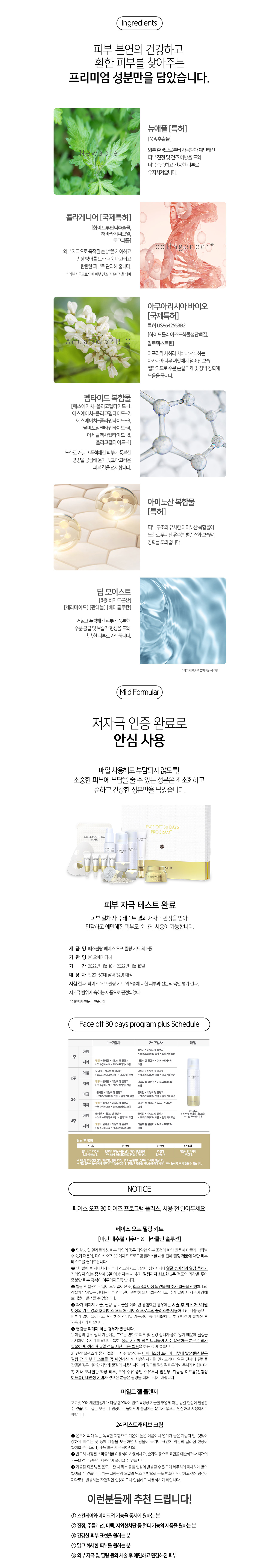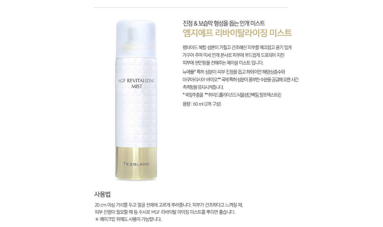 | 사용상 주의사항 | 사용할 때의 주의사항 : 1) 화장품 사용 시 또는 사용 후 직사광선에 의하여 사용부위가 붉은 반점, 부어오름또는 가려움증 등의 이상 증상이나 부작용이 있는 경우에는 전문의 등과 상담할 것 2) 상처가 있는 부위 등에는사용을 자제할 것 3) 보관 및 취급 시 주의사항 가) 어린이의 손이 닿지 않는 곳에 보관할 것 나) 직사광선을 피해서 보관할 것 4) 알갱이가 눈에 들어갔을 때에는 물로 씻어내고, 이상이 있는 경우에는 전문의와 상담할 것(마린 내추럴 파우더에 한함) 5) 눈 주위를 피하여 사용할 것(마린 내추럴 파우더, 퀵 수딩 마스크에 한함) 6) 특정부위에 계속하여 장기간 사용하지 말 것 7) 가능한 한 인체에서 0.2 m 이상 떨어져서 사용할 것 8) 눈 주위 또는 점막 등에 분사하지 말 것. 다만, 자외선 차단제의 경우 얼굴에 직접 분사하지 말고 손에 덜어 얼굴에 바를 것 9) 분사가스는 직접 흡입하지 않도록 주의할 것 10) 고압가스를 사용하여 위험하므로 다음의 주의를 지킬 것 가)온도가 40℃ 이상 되는 장소에 보관하지 말 것 나) 밀폐된 장소에 보관하지 말 것 다) 사용 후 잔 가스가 없도록하여 버릴 것 라) 불 속에 버리지 말 것 (6~10 MGF 리바이탈라이징 미스트에 한함) |