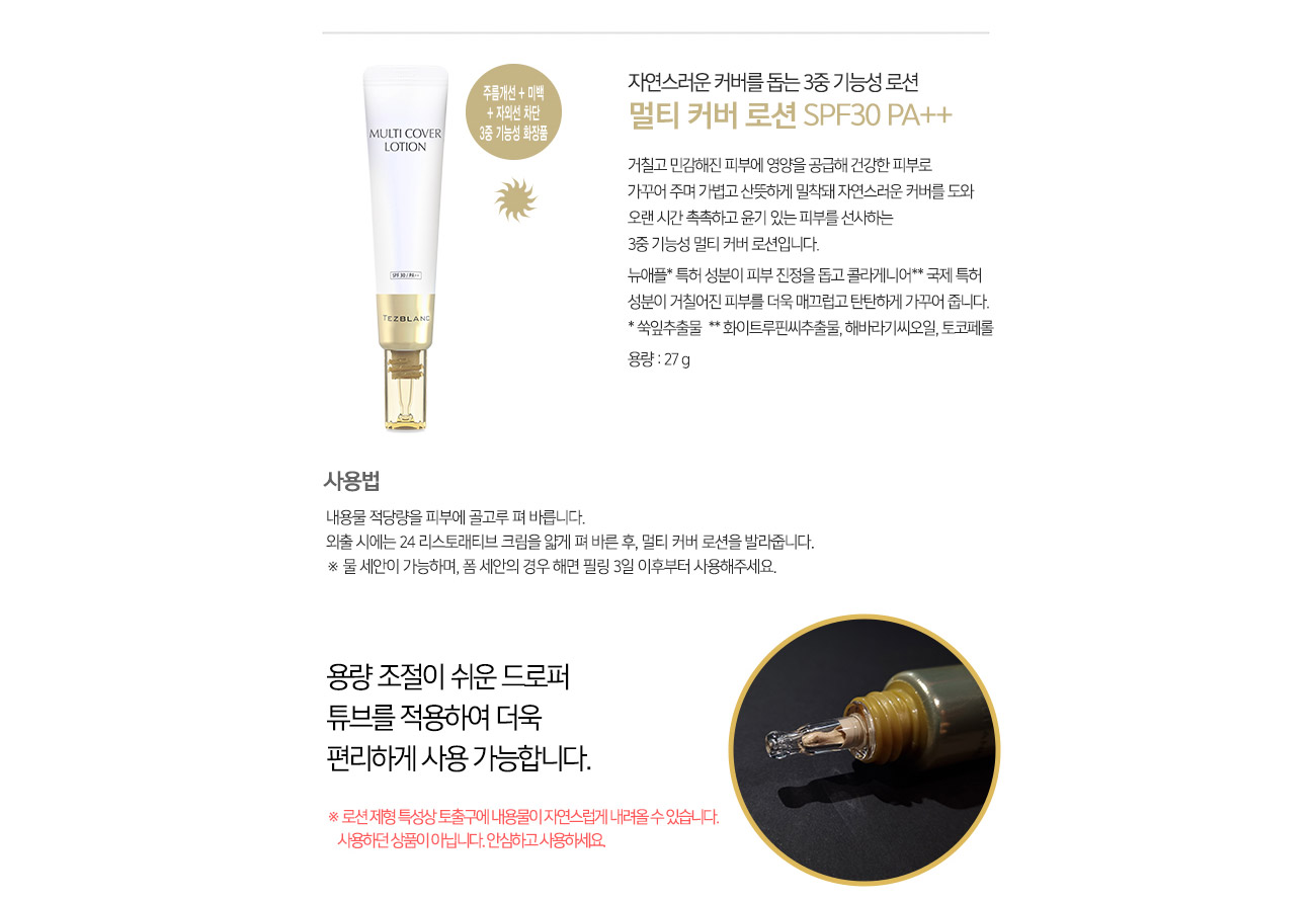 | 기능성 | 멀티 커버 로션 : 3중기능성화장품 (미백 + 주름개선 + 자외선차단 SPF30 PA++ |